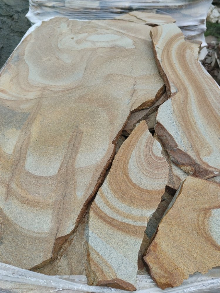 Песчаник жёлтый с разводами - для работ по облицовке цоколя, отмостки, стен, фундаментов, заборов.