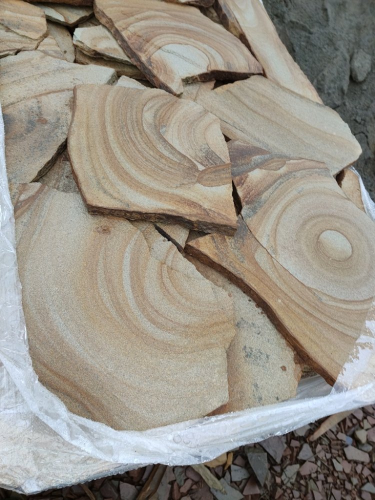 Песчаник жёлтый с разводами - для работ по мощению дорожек и площадок на землю и грунтовое основание, а также на песчано-цементно-щебёночное основание.